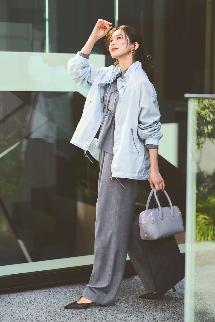 ブルゾン¥96,800(タトラス/タトラス カスタマーセンター)シャツ¥44,000パンツ¥44,000(ソブ/フィルム)バッグ¥53,900(ヴァジック/ヴァジック ジャパン)パンプス¥17,600(ダイアナ/ダイアナ 銀座本店)ピアス¥34,100(プリュイ/プリュイ トウキョウ)
