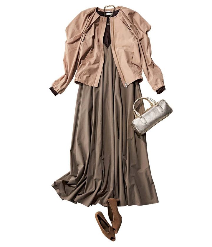 ブルゾン¥74,800(コラム/エストネーション)ブラウンシアートップス¥8,800(マルゥ ユナイテッドアローズ/ユナイテッドアローズ 渋谷スクランブルスクエア店)キャミワンピース¥39,600(ポステレガント)ゴールドバッグ¥49,500 (リンレザー)スエードオープントウーパンプス¥25,300(オデット エ オデール/オデット エ オディール 新宿店)ネックレス¥16,500(アビステ)