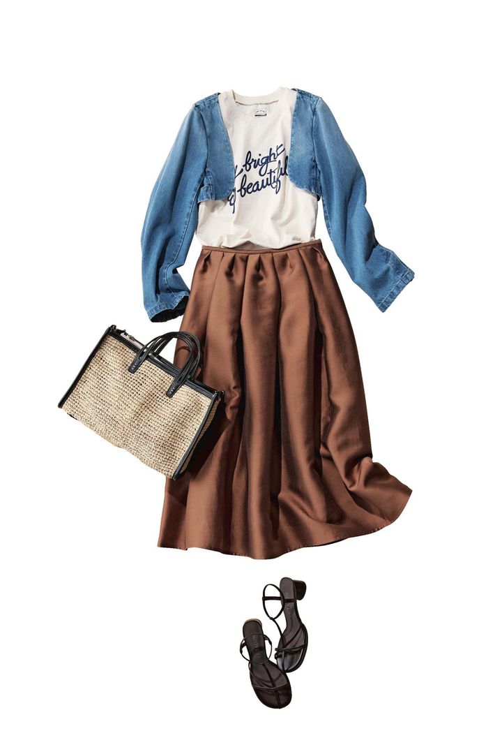 デニムボレロ¥39,600(ピース/ガリャルダガランテ 青山店)ロゴTシャツ¥8,580(ミクスタ フォー ユナイテッドアローズ/ユナイテッドアローズ 渋谷スクランブルスクエア店)スカート¥44,000(ソブ/フィルム)ラフィアバッグ¥60,500(A VACATION/ebure)サンダル¥12,650(ル タロン/ル タロン 有楽町マルイ店)
