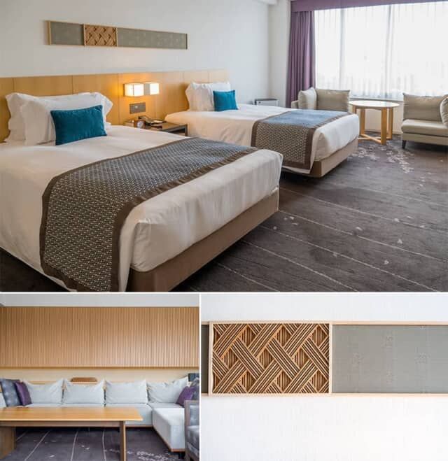 全ての客室にはシモンズ社のベッドマット「ビューティレストプレミアム」シリーズが採用され、包み込まれるような寝心地を体験。ヘッドボードには “編む” をテーマに、京都の指物職人が手作りした京組みの立体木工と、ザ・プリンス さくらタワー東京のオリジナル「桜紋」がデザインされた西陣織のアートワークが飾られています。
