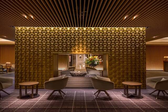 江戸の町の入口となる藩政時代の品川宿にはじまり、新幹線が停まる品川駅や羽田・成田へのアクセスのよさなど、人と人とが行き交いクロスする土地柄から、館内のデザインは “編む” がテーマ。ロビーの大きなアートワークには、金属で日本の伝統模様「網代柄」を重ねます。その中央には水盤が置かれ、チェックインの手続きの時も心地よい水音にくつろぐ演出です。