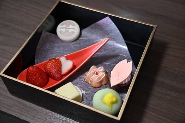 冷蔵庫に用意されたお重の中には、季節のフルーツや「桜紋」のデザイン入りマカロン、上生菓子を思わせる彩りの美しい和菓子が入っていて、お茶と一緒にいただきました。