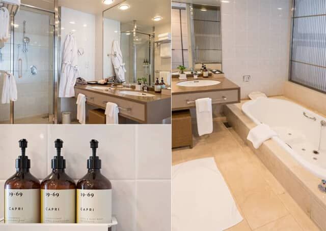 全ての客室にジェットバスを備えるゴージャスさ。スイートルームはバスルームのスペースも広く、独立したガラス張りのシャワーブースもあって、バスローブも用意します。バスアメニティーはエグゼクティブフロアの客室とジュニアスイート、コーナールーム限定のスウェーデンの香水ブランド「19-69(ナインティーン シックスティナイン)」の「カプリ」シリーズ。サラリとまとまる髪としっとり系のボディソープで、ボタニカルな爽やかで優しい香りに包まれます。