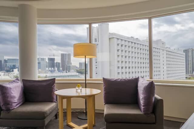 広い窓からは日本を代表する建築家、村野藤吾が設計したグランドプリンスホテル新高輪の客室棟をダイナミックなアングルで眺望。時期は未定ながら閉館が予定されている建物だけに、この部屋から目に焼き付けておけるのも貴重な体験です。