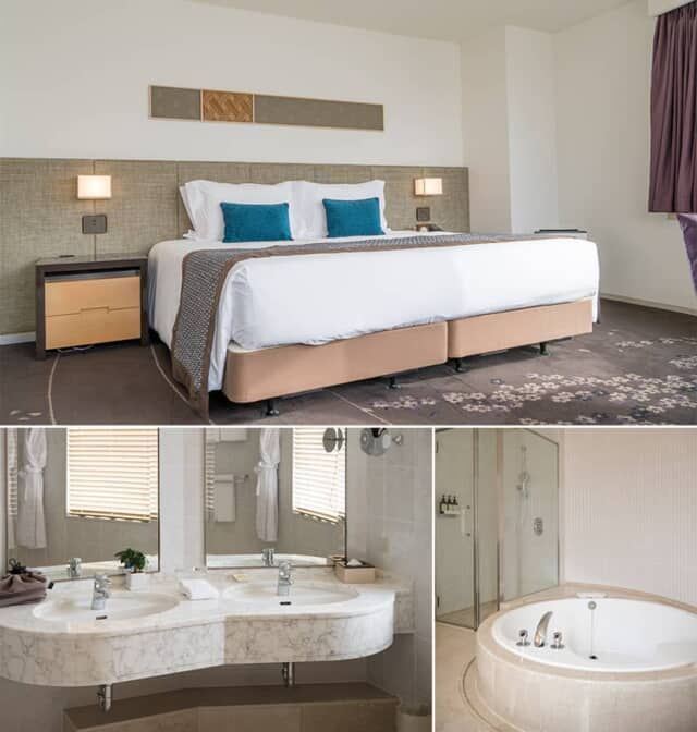 シモンズ社製のベッドはキングサイズで幅200cm × 長さ203cm。大理石の洗面はダブルベイシンを採用。ジュニアスイートのバスルームにのみ丸く広めのバスタブを備え、ゴージャスなバスタイムを楽しめます。