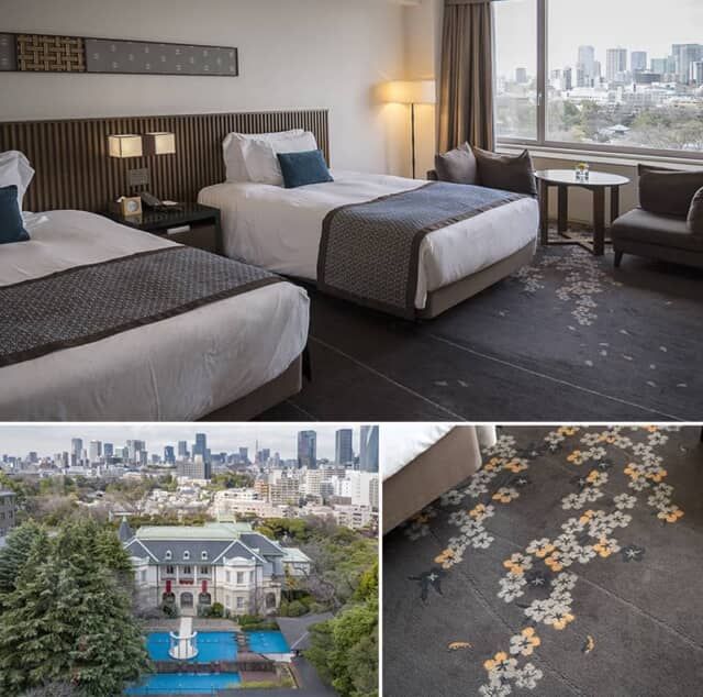 11階から14階の高層階にある東京タワー側の客室です。ベッド側の壁に架かるアートワークの西陣織は濃い色で、日本庭園との調和を考慮した色調。全ての部屋に敷かれたカーペットには、舞い散る桜の花びらが描かれています。