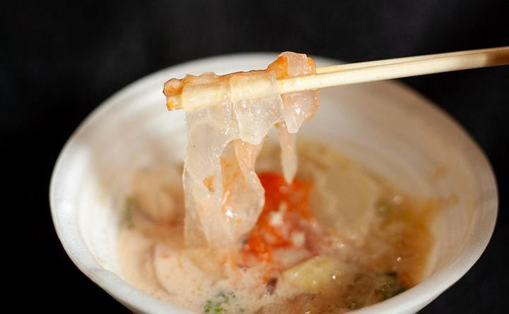 透明感のあるタンミョンは、つるみがあって、もちもちとした弾力があります。一般的な春雨との違いは、やはりこのもちもち感ですよね。先ほど言ったとおり、キャベツが占める割合も多いので、タンミョン自体はあまり多くない印象ですが、この弾力のおかげで食べごたえを感じられるのだと思います。
