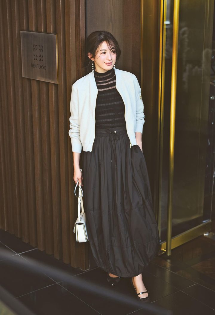 ボリュームスカートの重さを、白の短丈カーデが軽やかに中和。コンパクトな丈感でバランスを整えつつ、コーデ全体にメリハリをプラス。シンプル配色でもぐっと洗練された印象に。