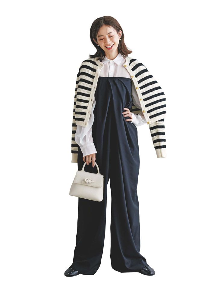 オールインワン(シーニュ)シアーシャツ¥37,400(ハイク/ボウルズ)カーディガン¥27,500〈2月発売〉(ツル バイ マリコ オイカワ)バッグ¥51,700(ヴァジック/ヴァジックジャパン)シューズ¥35,200(シーセイ/アイネックス)ピアス¥33,000(リューク)