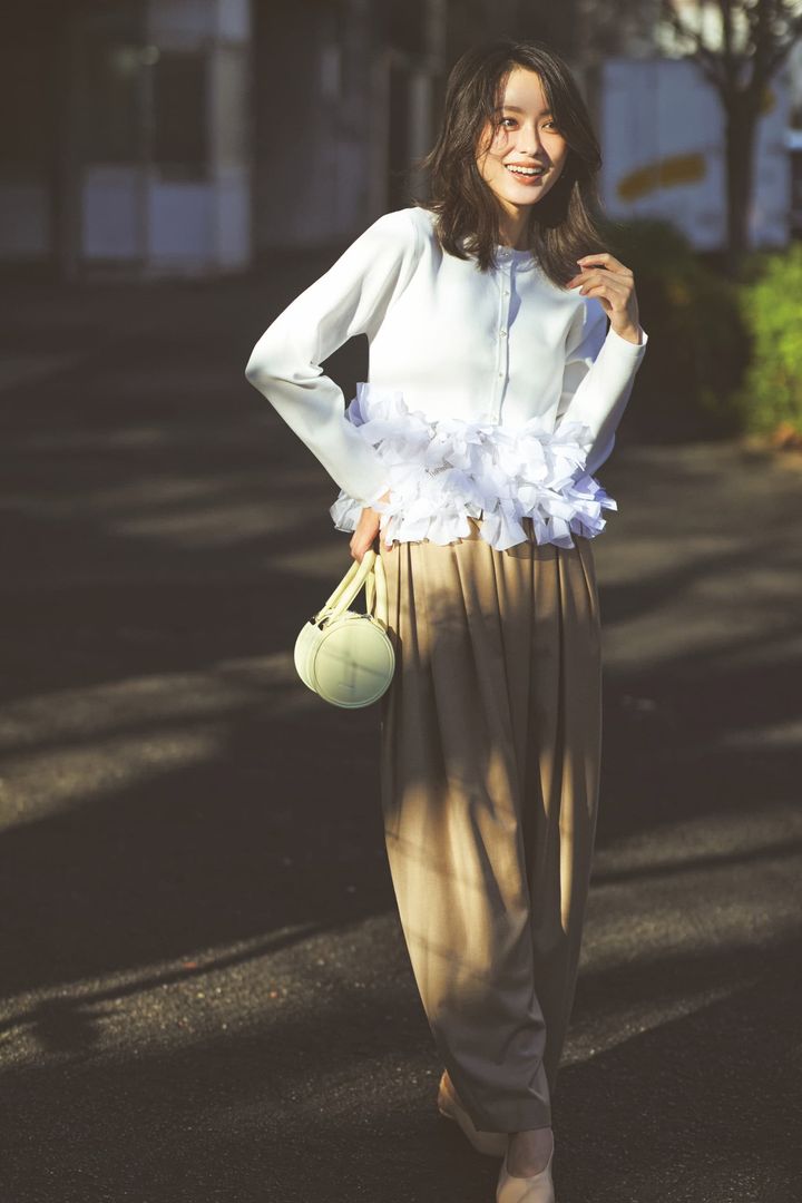 チュールやリボンのディテールが動きを生み、シンプルコーデを華やかに格上げ。コンパクトなシルエットで全体をすっきり見せつつ、パンツ合わせでも女性らしさをキープできます。
