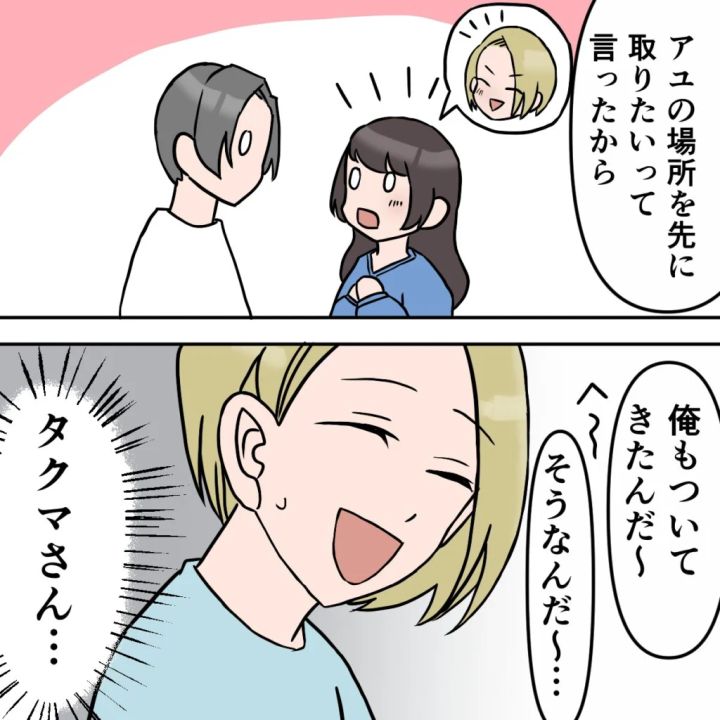 「アユの場所を先に取りたいって言ったから俺もついてきたんだ~」そう言われ、私は引きつった笑顔のまま「そうなんだ~」と返すので精一杯。タクマさん、いつの間にサユリを呼び捨てにするようになったんだろう。