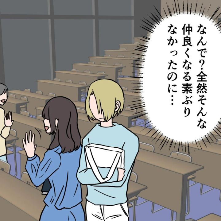 タクマさんに親友のサユリを紹介してから1週間が経ったある日のこと。私は教室で、楽しそうに談笑するサユリとタクマさんの姿を目にしてしまいました。スマホをのぞき込みながら話す2人の距離は、思わず恋人同士かと疑ってしまうほど。いったい何があってあそこまで打ち解けたのか、私にはまったく分かりませんでした。
