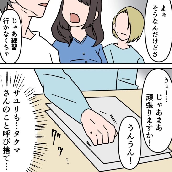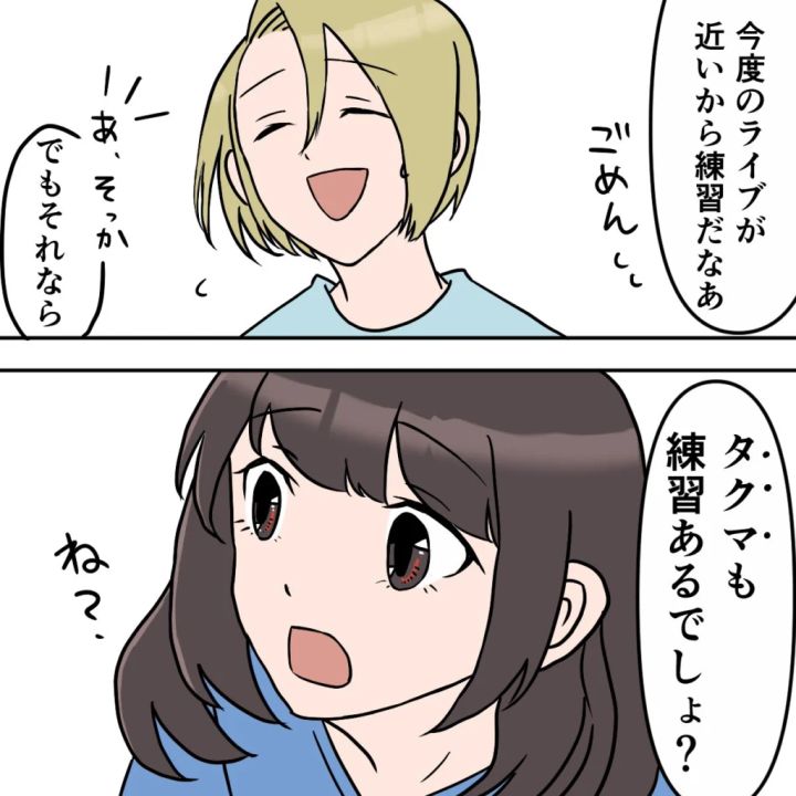 「今度のライブが近いから練習だなあ、ごめん」そう返すと、サユリは少し考えるようにして、「あ、そっか・・・でもそれなら、タクマも練習あるでしょ?」とタクマさんにたずねます。