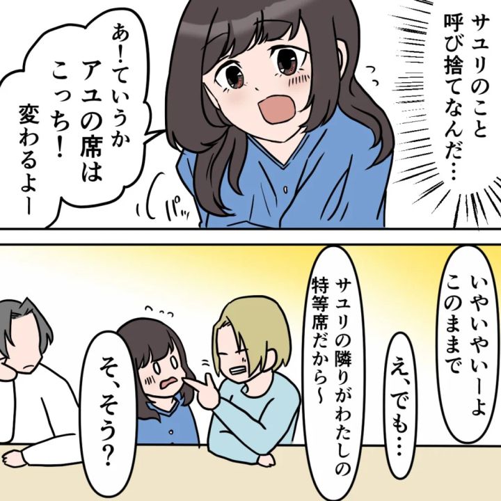 すると、サユリが思い出したように「あ!ていうかアユの席はこっち!変わるよ」と言ってきました。私は「いやいやいーよ、このままで」と断りましたが、サユリは「え、でも・・・」と、どこか納得いかない様子。「サユリの隣が私の特等席だから~」そう言って頬をつつくと、サユリは少し照れたように、「そ、そう?」と笑いました。
