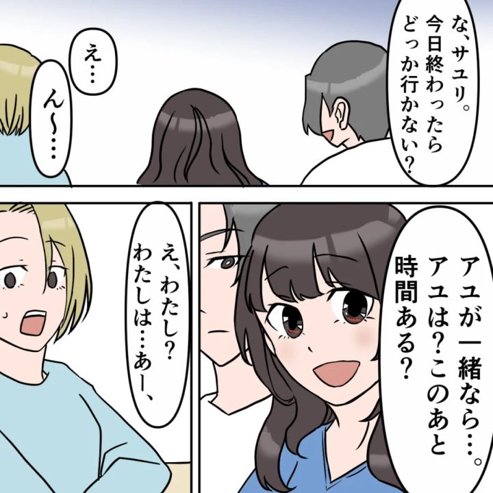するとタクマさんが、「サユリ、今日終わったらどっか行かない?」とサユリに声をかけます。サユリは少し考え込んだあと、「アユが一緒なら・・・アユは?このあと時間ある?」と、私にたずねてきました。タクマさんがサユリを誘ったことにショックを隠せない私は、「え、わたし?わたしは・・・あー」と、返事に詰まってしまいます。