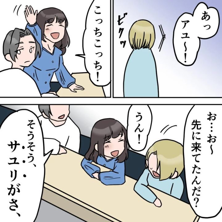 私は2人の存在に気づいていながらも声をかけることができず、あえて視界に入っていないふりをして離れた席に座ろうとしました。けれど「アユ~!こっちこっち」とサユリに呼ばれてしまい、「お、お~先に来てたんだ?」と平静を装いながら彼女の隣に腰を下ろします。するとタクマさんが、「そうそう、サユリがさ」と話し始めました。