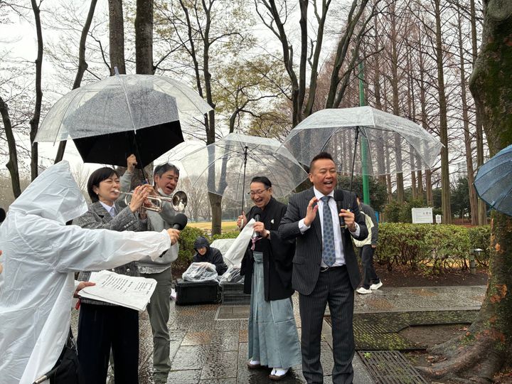 そして、キャンパスの中央通りに場所を移してストリートライブへ。黒紋付きに袴姿の昇太とスーツ姿のたい平が集まった卒業生たちを前にまずは東海大学の校歌を熱唱し、昇太は「学生の頃散々歌いましたから」と、懐かしむように力強く歌い上げた。そして、この日のために練習を重ねてきた乾が、昇太から借りたトランペットを手に「贈る言葉」の生演奏を披露。昇太・たい平・番組スタッフの合唱をバックに、心のこもった音色を響かせた。たい平は「66歳でよく勉強しました、昇太のバカちんがー!」と叫び、最大の祝福を贈った。