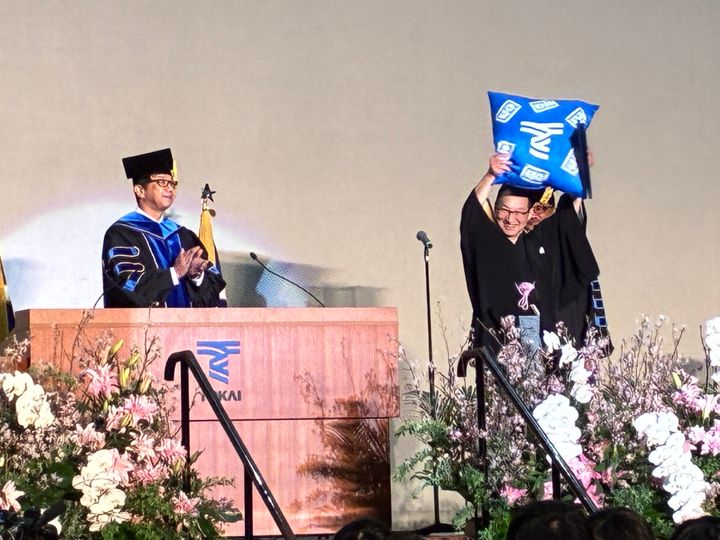 昇太が「1978年から通っておりました」と語る母校、東海大学。数年前に同大学の客員教授に就任したが、中退してるから学生に対して偉そうに言えず、やりづらさを感じていた昇太は、大学の「再入学制度」を利用し、この日、卒業式を迎えることとなった。