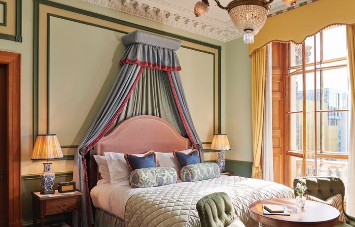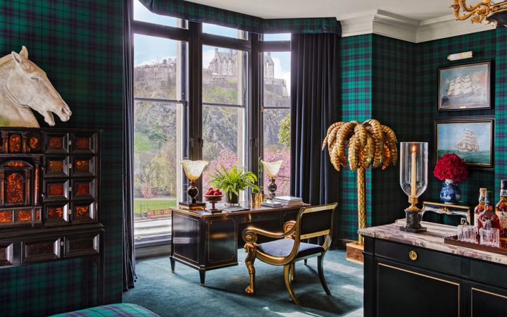 マキシマリスト的なルックを目指すなら、1つのパターンに徹底的にこだわってみては? ぜひ「カラー・ドレンチング」というコンセプトからヒントをもらおう。これは、部屋全体に単一の色、または関連する数色を使うというやり方だが、ここではそれを「パターン」で表現する。写真は、スコットランドのエディンバラにある100 プリンス・ストリートの客室。美しいグリーンとブルーのタータンチェックが、寝具から壁紙、カーテンを染め上げている。