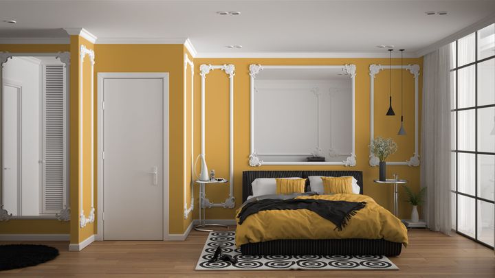 2色に塗り分けた壁がもたらす効果を過小評価してはいけない。自宅のベッドルームにピクチャーフレーム型のモールディングがあるのなら、アクセントになるような色で塗ろう。上で紹介したグレンイーグルス・タウンハウスでは、洗練されたダークグリーンが部屋を立体的に見せている。こうしたモールディングは、賃貸物件にもおすすめ。後からモールディングを貼り付けることも可能だ。やり方は簡単。モールディングを必要なサイズにカットして、両面テープで壁に貼る。そうすれば、取り外しに苦労することもない。
