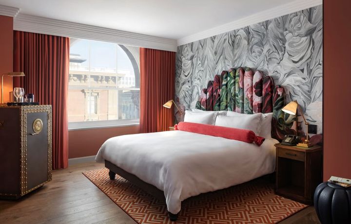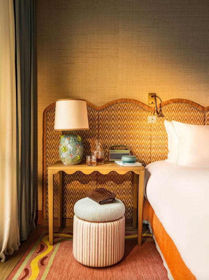 ワシントンのホテル、リッグスのベッドルームを見ると、パターンをミックスすることに躊躇する理由などないことに気付く。客室に足を踏み入れるとすぐに、ベッドの後ろに貼られた見事なマーブル模様の壁紙に目を奪われた。それから、壁紙のパターンと相性抜群のカラフルなヘッドボードにも。