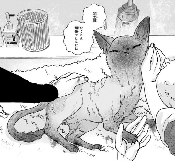 朝待夜駆さん(以下、朝待):家に入れたばかりのときだったと思います。痩せっぽちで怪我だらけなのに、私の足に向かって頭突きをして一生懸命甘えてくるんですよね。まだ朔太郎は世界を信じているんだ、と。こんなにボロボロにされて、足が変形するような怪我を負わされて、寒くて痛くてひもじくて、それだけの世界だったのに……。世界に裏切られてきた私の心にこみ上げるものがありました。