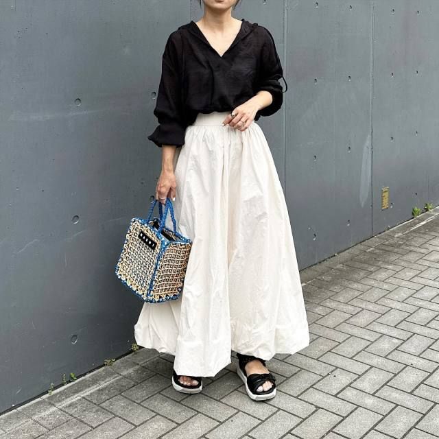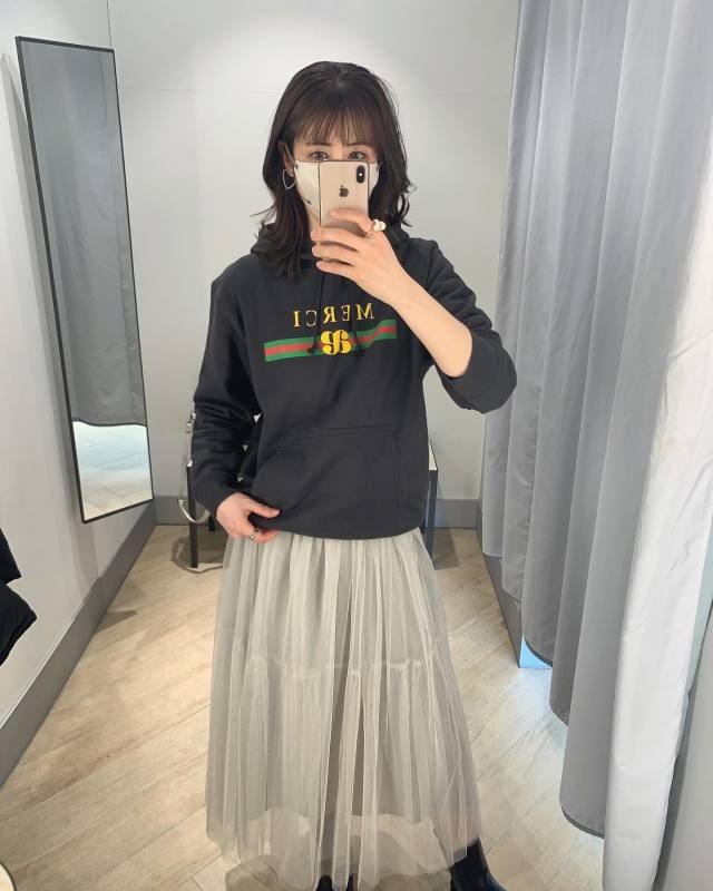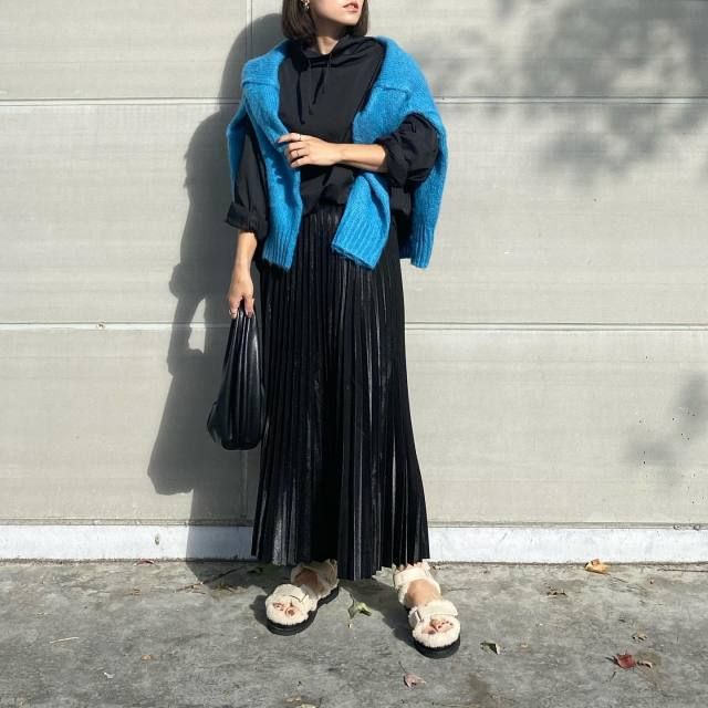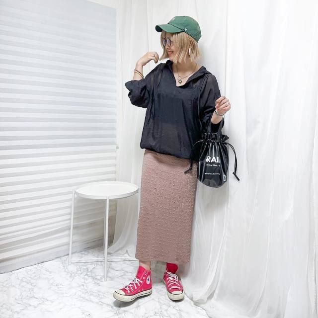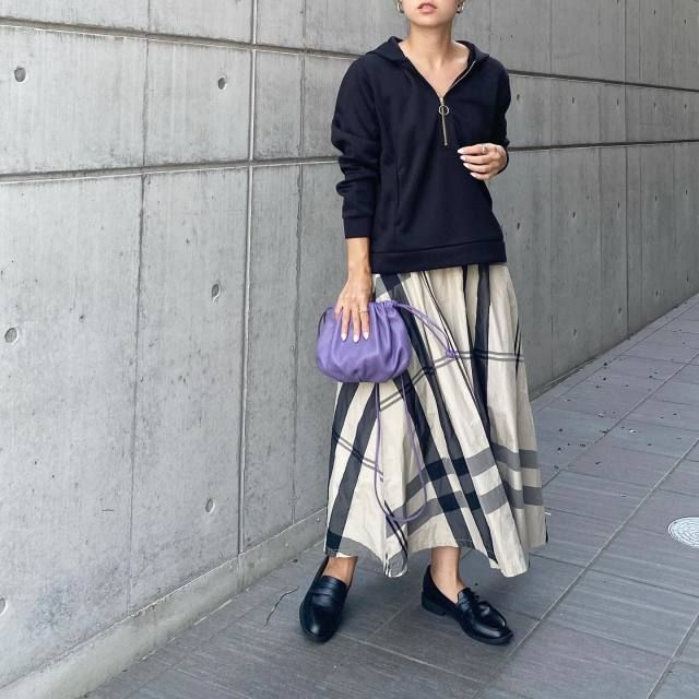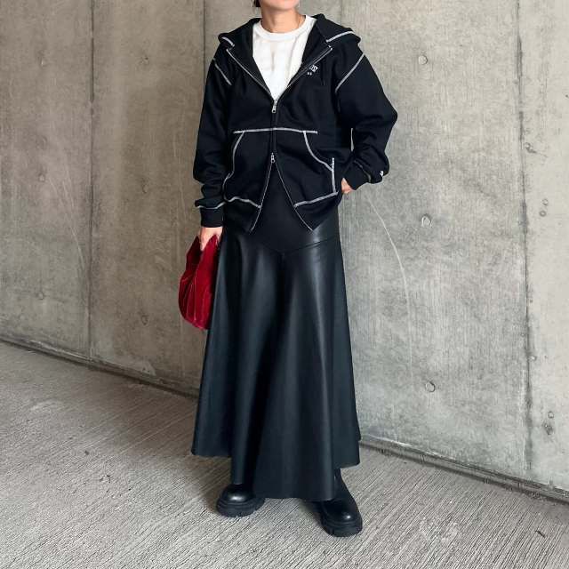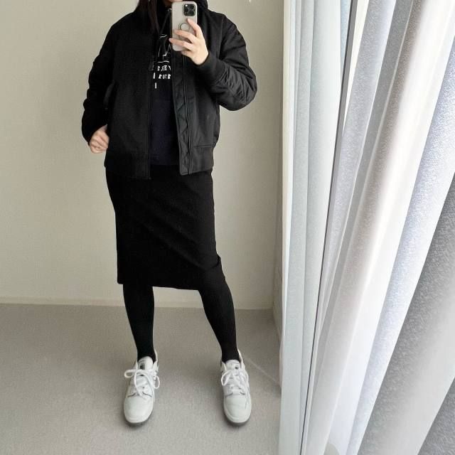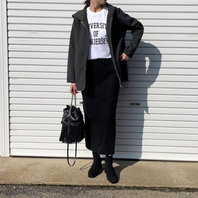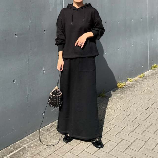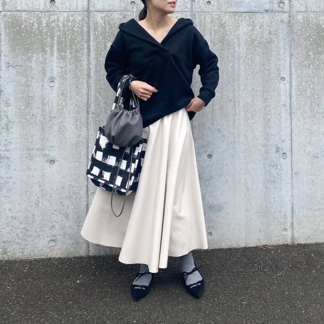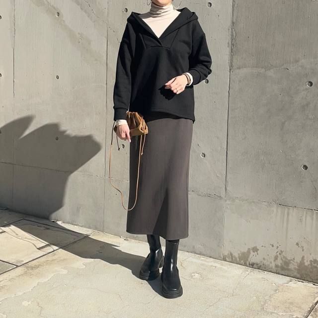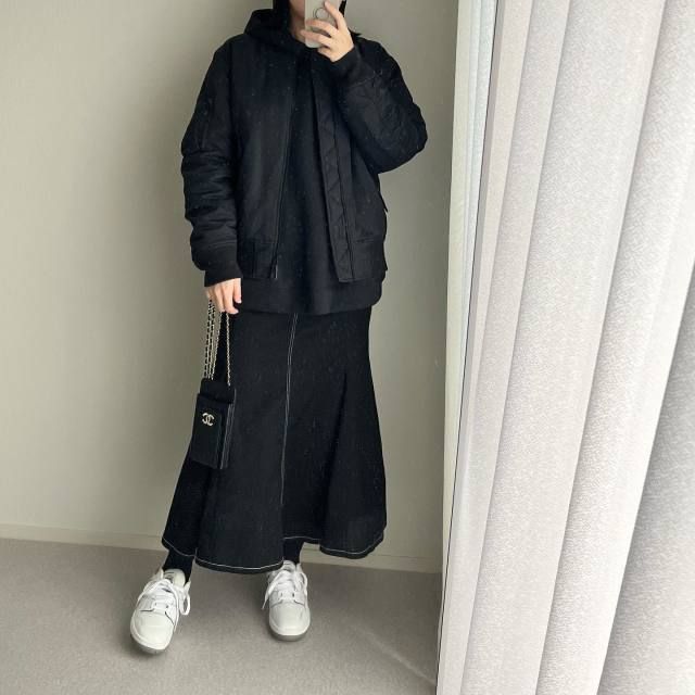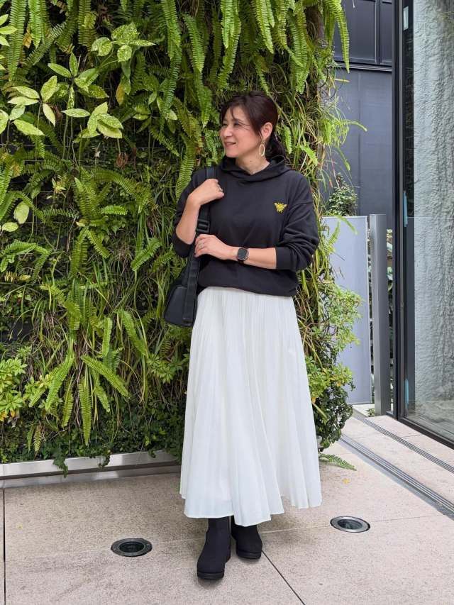 【40代50代】黒パーカー×スカートのコーデ