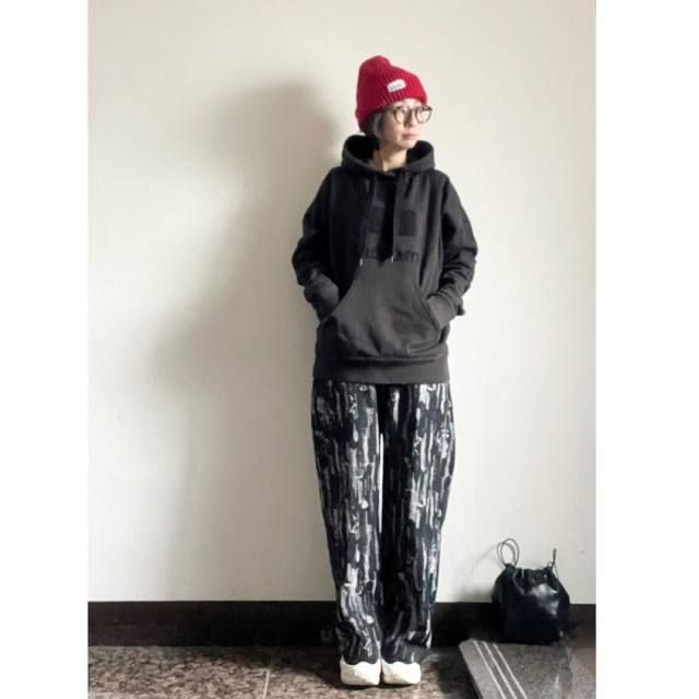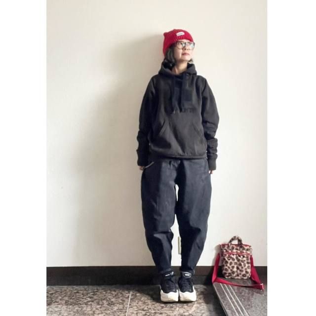 【40代50代】黒ロゴパーカーのコーデ