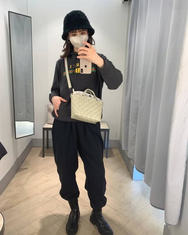 【40代50代】黒パーカー×ミニバッグのコーデ