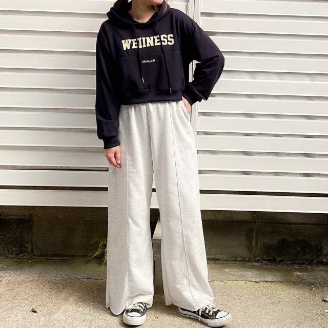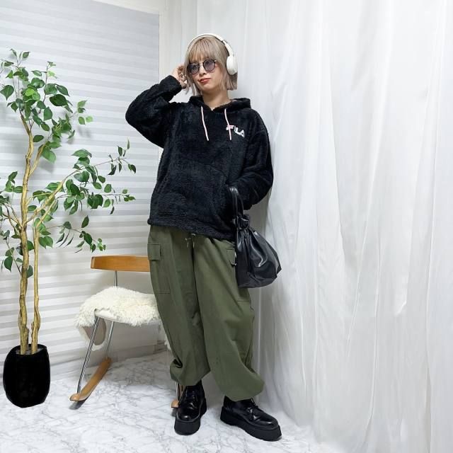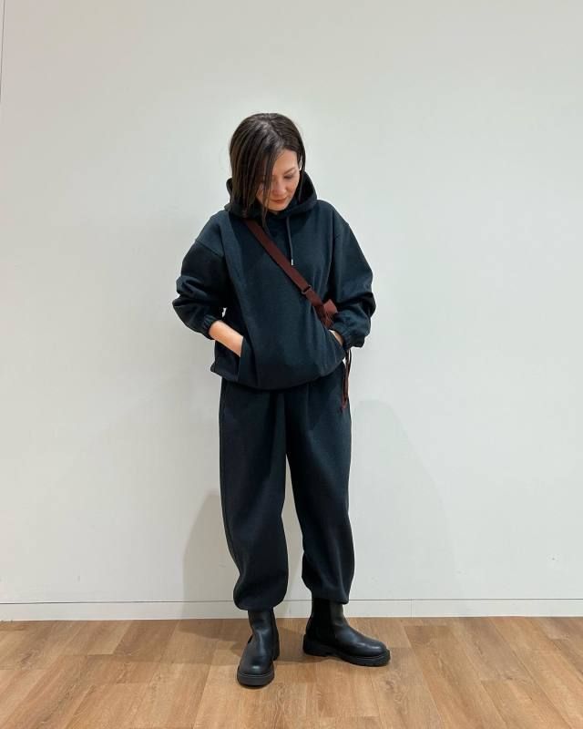 【40代50代】黒パーカー×ゆったりパンツ×ブーツのコーデ