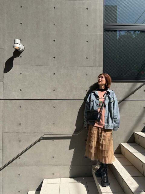ティアードフリルがスイートなピンクのチュールスカートなど、甘いコーデを引き締めたいときこそデニムジャケットの出番。バッグや靴は重厚感のあるものを選ぶと大人っぽくまとまります。