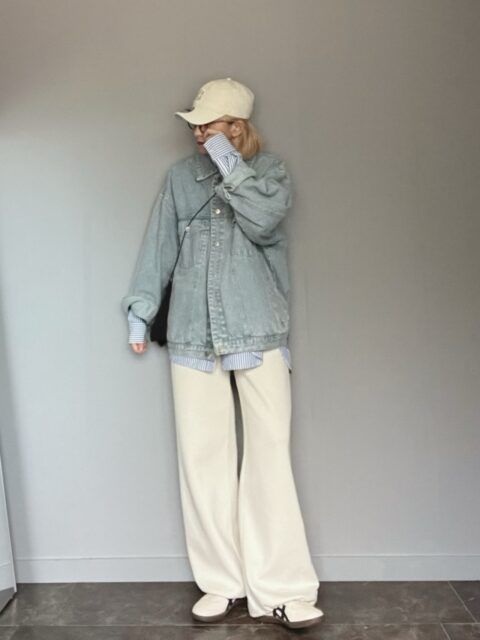 ご近所ランチにぴったりなキャップ×スウェットパンツ×デニムジャケットコーデ!
