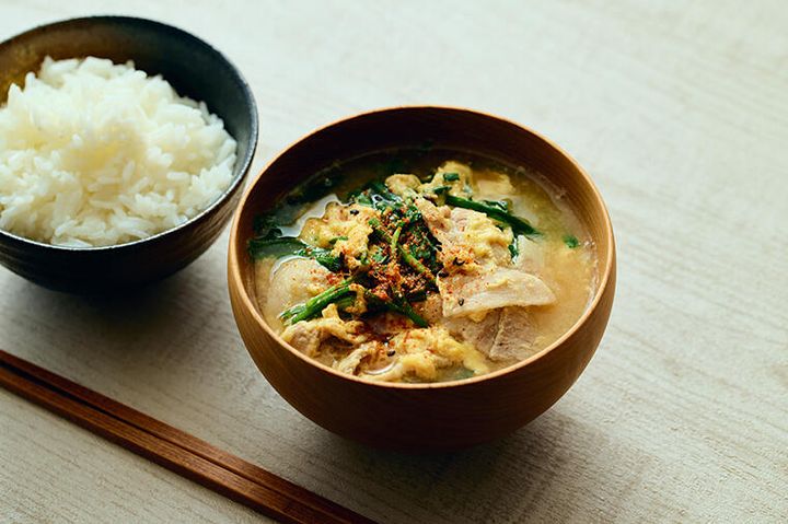 3. 青々としたにらの香りと、ふわふわたまご、豚の旨味の三重奏。白メシが進みすぎる「にらたま豚汁」/4月3日の『たまごスープ日めくりカレンダー』