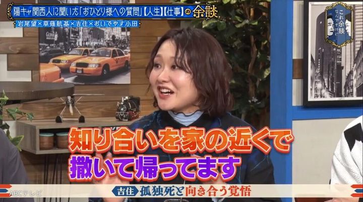 自分が孤独死する想定でいる吉住は、死後のことまで考えている。知人を自分の死体の第一発見者にさせるのは申し訳ないため、「知り合いと家の近くまで帰るんですけど、撒いて帰ってます。家がバレないために」とのこと。