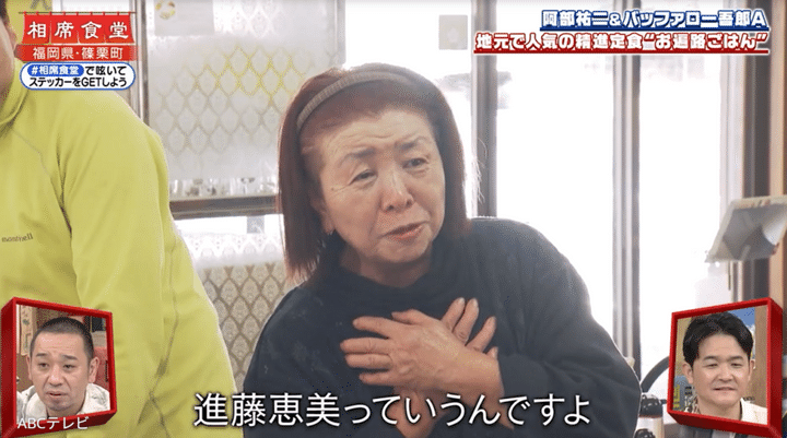 “お遍路ごはん”がおいしい食事処でAは、地元民から篠栗町の有名人・シンドウエミさんを紹介された。シンドウエミといえば、1970年代にドラマや映画で活躍して、「熟女ヌードの先駆け」と言われた、元女優・新藤恵美が有名だ。“篠栗町のシンドウエミさん”は、もちろん熟女ヌードの先駆者ではなく、漢字1字違いの同姓同名の別人だ。