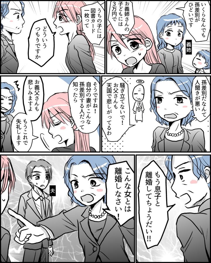子どもたちの入学祝いにと渡されたお祝いのポチ袋。義姉の子どもは3万円、かたやこちらは千円の図書カード。これにはブチギレても文句ないでしょう。しかしお嫁さんの反撃に義母は逆ギレ。あげく「離婚よ!」と連呼する始末。旦那は何も言えず立ち尽くし……。