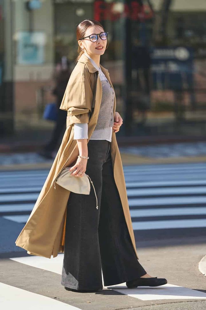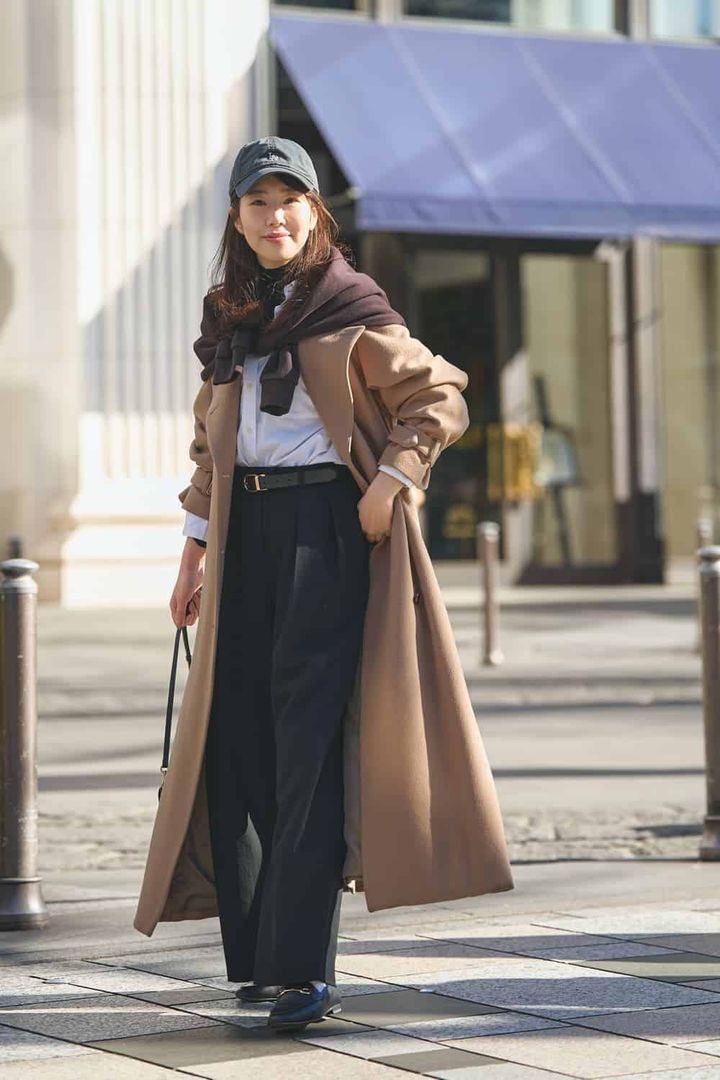 CREDONAのワイドパンツは、ゆったりとしたシルエットでどんなスタイルにも馴染む万能な一本。普段はシャツやニットを合わせ通勤に活躍させていますが、休日はスウェットやキャップを投入してスポーティーなラフさをプラス。コートやシャツは、シンプルながら女性らしさもあるanuansのものを合わせて、カジュアルすぎないようにまとめました。