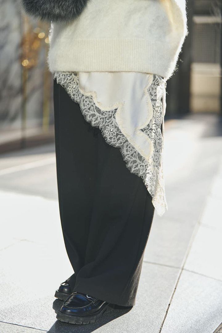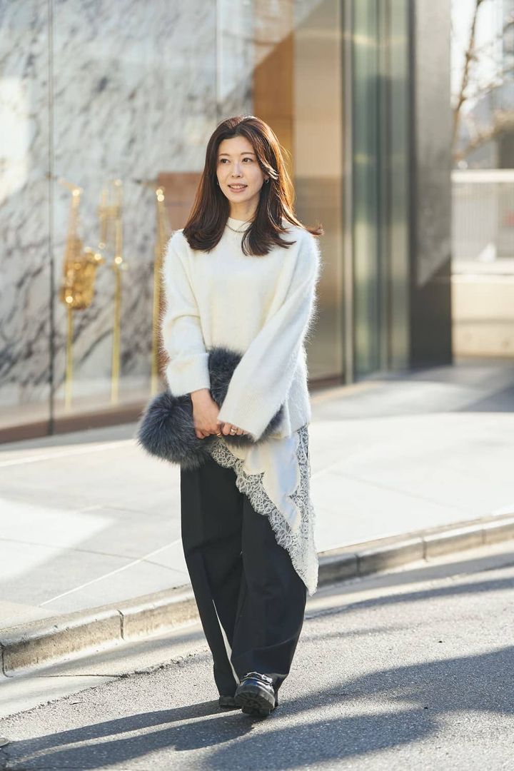 レースやファーの甘さを、黒パンツとビットローファーでマニッシュに引き締め。仕上げにシルバーのナバホパールで輝きを添え、地味見えしない『異素材モノトーンコーデ』に仕上げました。
