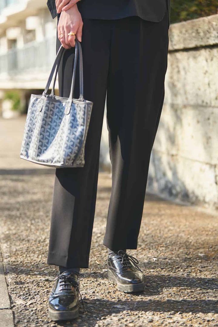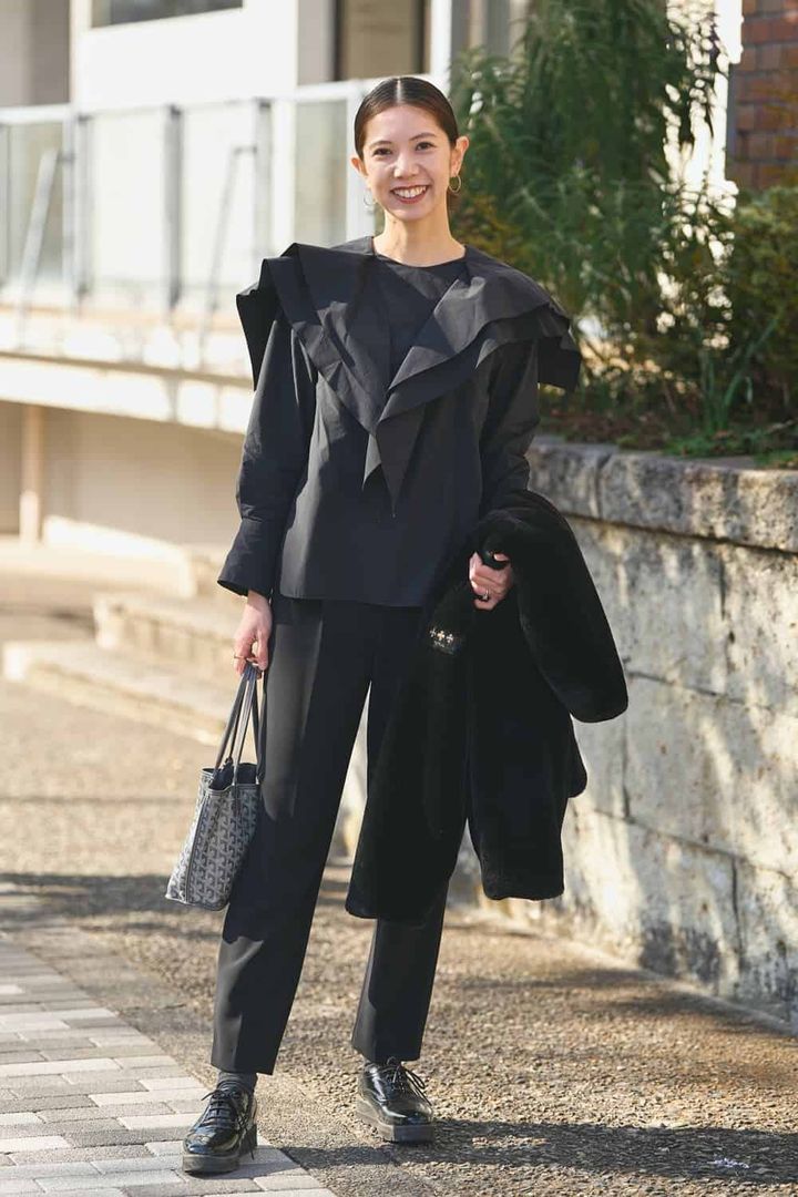 高身長を活かし、甘さを削ぎ落とした潔い辛口スタイルに。黒パンツ×ブラウスも、とろみ素材ではなくハリのあるものを選んで甘さをセーブしています。allurevilleはデザイン性の高い辛口アイテムが見つかるお気に入りブランド。黒パンツはカチッとした場面で使いたいので、スラッとしたシルエットのものを選んでいます。