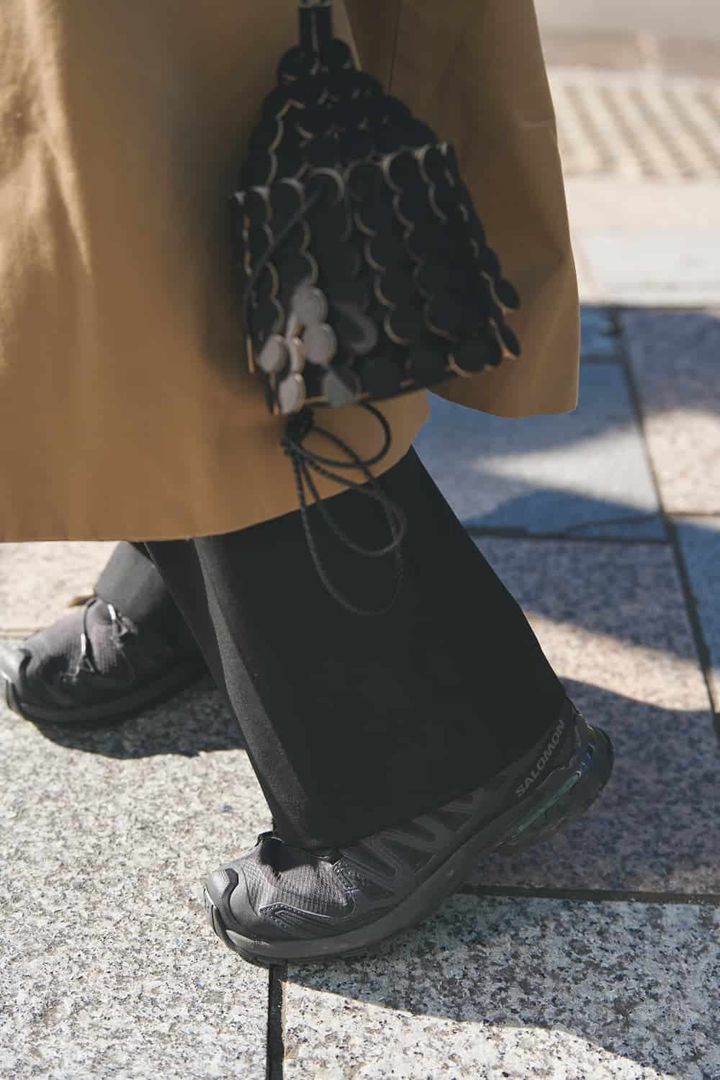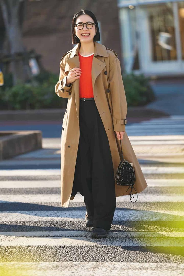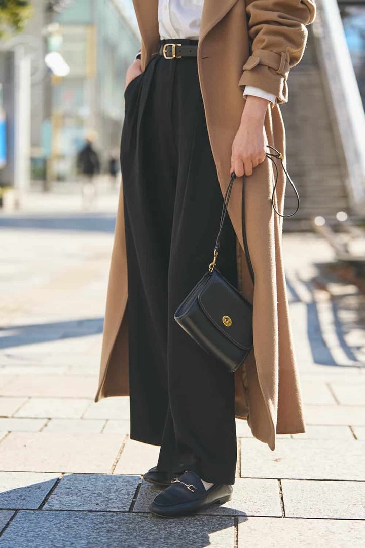 UNIQLOのタックワイドパンツは、あえてワンサイズ上げてゆるっとはくのが今の気分。HYKEのトラッドなコートの足元にSALOMONを合わせ、真面目すぎない大人の抜け感を意識しました。ボトムにボリュームがある分、トップスはタイトにまとめて好バランスに。マットな冬コーデに映えるオレンジを差し色にしつつ、仕上げにバッグで甘さをひとさじ加えました。