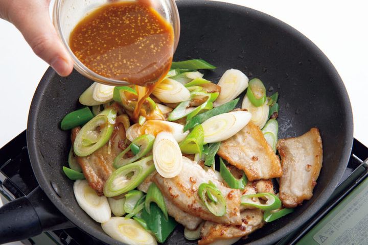 (2)フライパンにごま油を中火で熱し、豚肉を並べ入れる。両面を1~2分ずつ焼き、焼き色がついたらねぎを加えて1分ほど炒める。〈A〉をもう一度混ぜて加え、1~2分炒め合わせる。