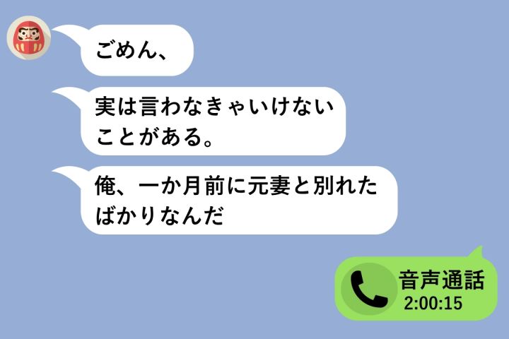 「ごめん、実は言わなきゃいけないことがある。俺、一か月前に元妻と別れたばかりなんだ」