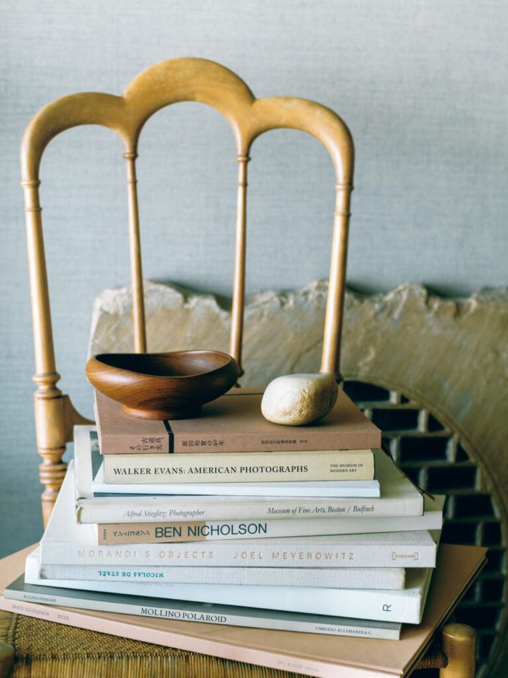 ダイニングの隅にそっと。背の美しい椅子の上に積まれた本、さらに置かれた石と器まで、色のグラデーションがなだらかに弧を描く。