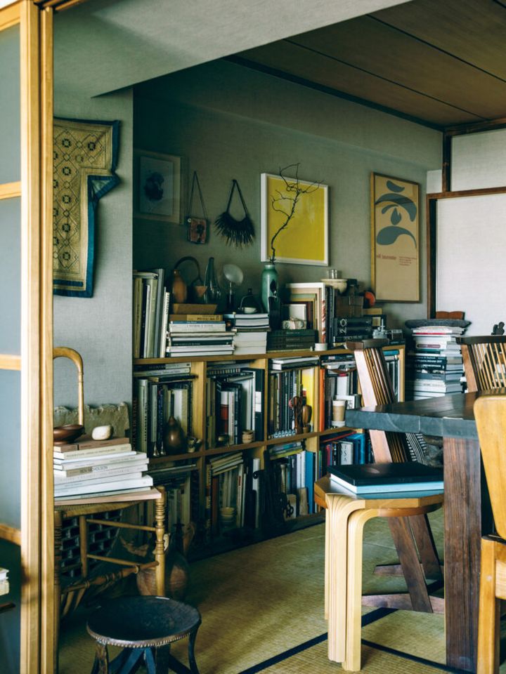 ダイニングとして使う和室のテーブル奥に配した本棚。民芸、ミッドセンチュリーモダンのデザイン書、現代美術や工芸の作品集がぎっしり詰まり、棚上にも積み上がった先には、様々な国や時代の匂いを放つものがちりばめられている。背景の異なるモノを、どう配し調和させるか、そうしたバランスのあり方を楽しむ、南雲浩二郎さんの脳と心を垣間見るようだ。