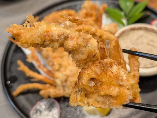 お箸で持つだけでもわかる柔らかさ。 殻が少しパリッとしているけど全体的にふっくらとしていて美味しい♪ 蟹味噌マヨネーズをつけて食べる贅沢な一品です。