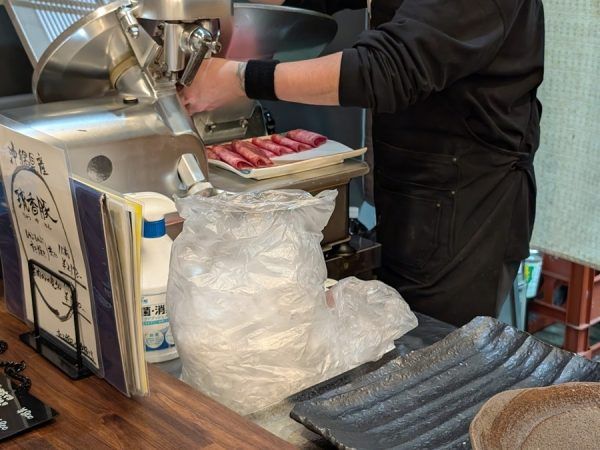 そして大将がカウンターの内側に置かれているスライサーで牛タンのスライスを開始。 きれいな赤色の牛タンがどんどんお皿に盛られていきます。 カウンターから見られる特権に食欲増幅。
