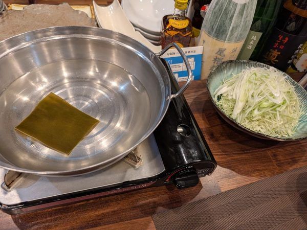 まずだしが沸騰したら昆布を取り出して野菜を投入。 野菜がしんなりとしたら牛タンをしゃぶしゃぶ。 たっぷり野菜を巻いたらポン酢をつけて実食!