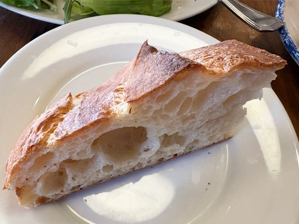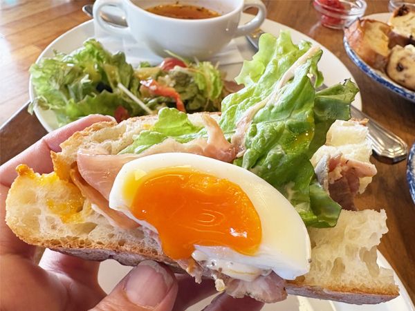 「サラダと合わせて食べるとおいしいですよ」とフォカッチャをテーブルに運んでくれたのもうれしいサービスでした。サラダと2種のハム、半熟卵をトッピングしたフォカッチャサンドも楽しめました。
