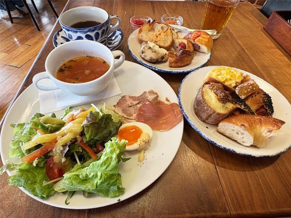 店内は朝の慌ただしさを忘れてしまうほど、おだやかな時間が流れています。広めのテーブルに通され、ひと通りの説明を受けます。カウンターに並んだパンとドリンクは好きなだけおかわり自由。プレートは、ドレッシングは2種から、ゆで卵半熟か固ゆでかを選ぶことができます。