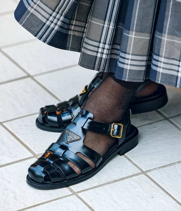 自転車で通勤することもあるため、ローヒールの靴がマストアイテム。プラダのグルカサンダルはどんなスタイルにも合う万能アイテムです。